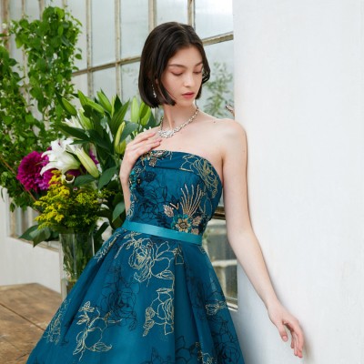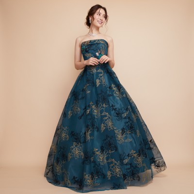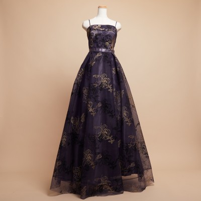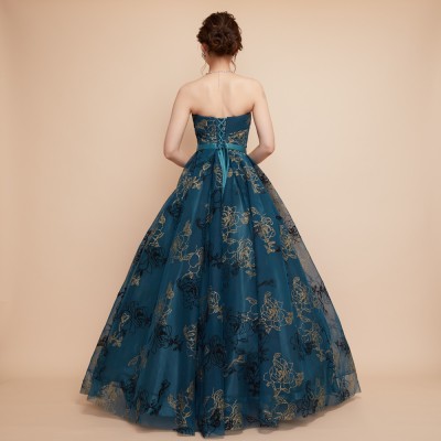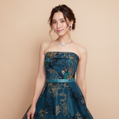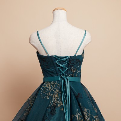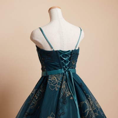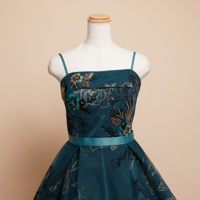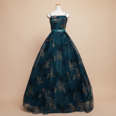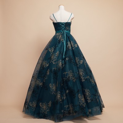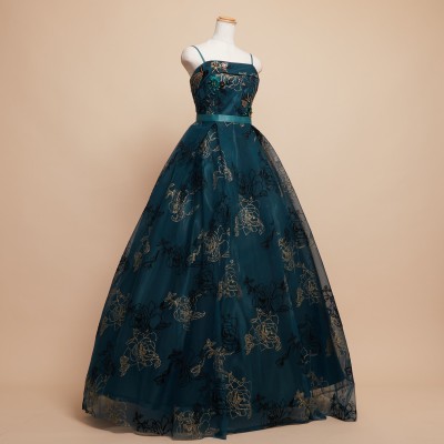 ゴールドグリッターとブラックフロッキーの薔薇模様が豪華さを際立たせるゴージャスドレス。大きくしっかりと広がったボリュームのあるスカートがとても華やかです。落ち着いたダークグリーンカラー。