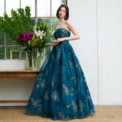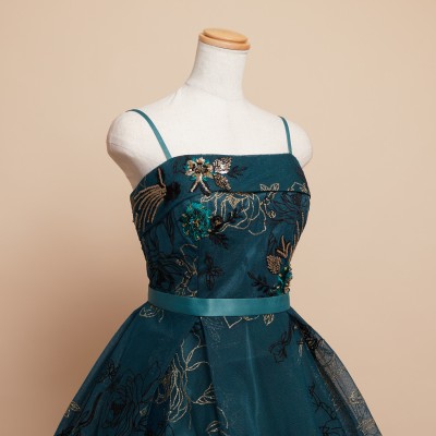 ゴールドブラックフロッキーチュール刺繍グリーンドレス