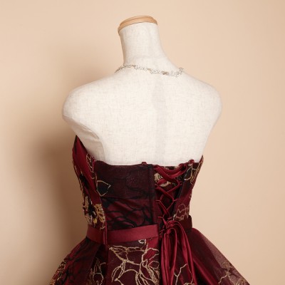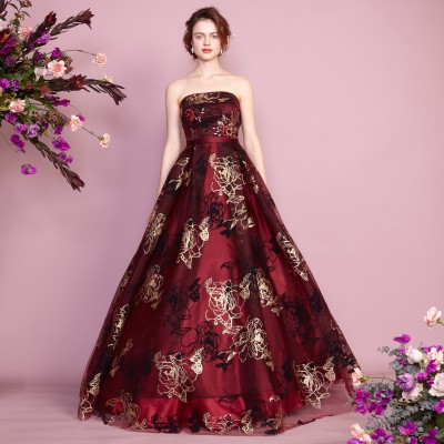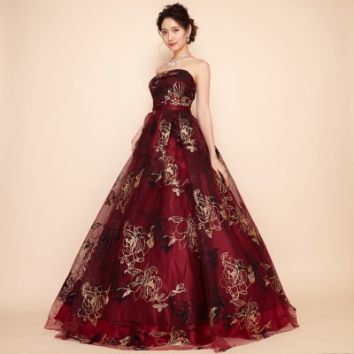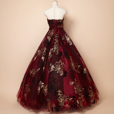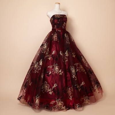 ゴールドグリッターとブラックフロッキーの薔薇模様が豪華さを際立たせるゴージャスドレス。大きく広がったスカートや深みのあるワインカラーが印象的な、大人の魅力を引き出してくれるステージドレスです。