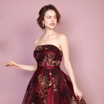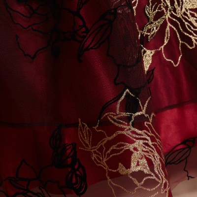 Wine Tulle Gold-Black Flower Flock Embroidery Gown