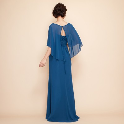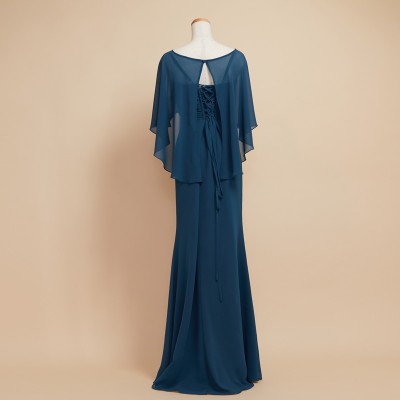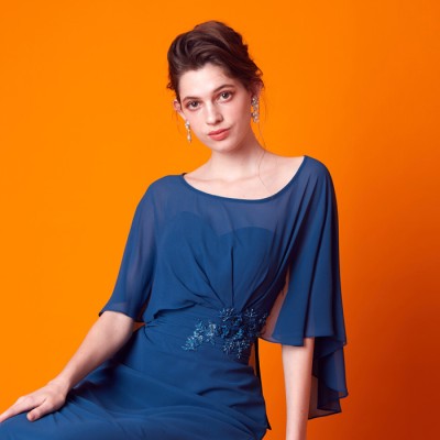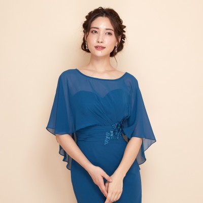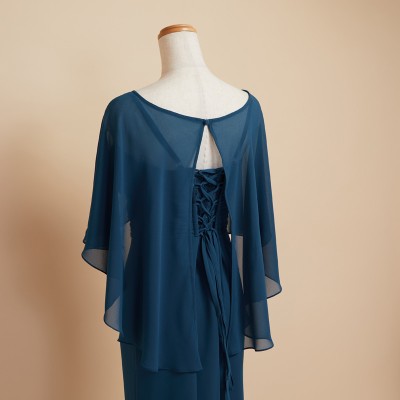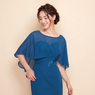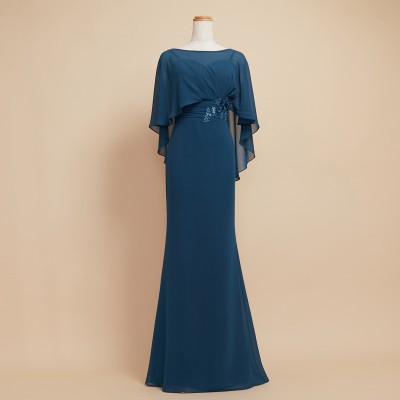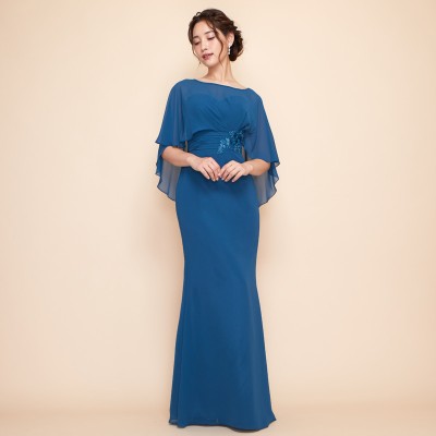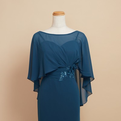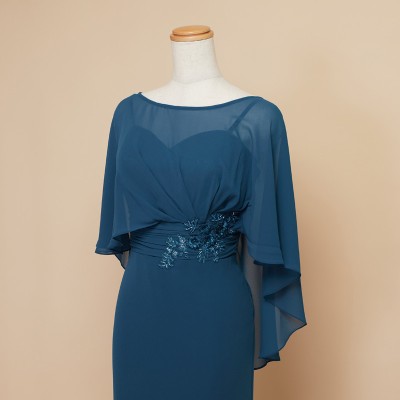 ケープを羽織ったかのようなデザインが特徴的なマーメイドスタイルドレスです。ふんわりと軽やかなシフォン生地で腕や背中の露出を抑えつつも、対照的なメリハリのマーメイドスタイルがとってもお洒落です。上品なレース刺繍もさり気ないワンポイント。クルーズパーティードレスや、マザーズドレスとしてご着用いただくのもおすすめです。上品で落ち着いたブルーグリーンカラー。