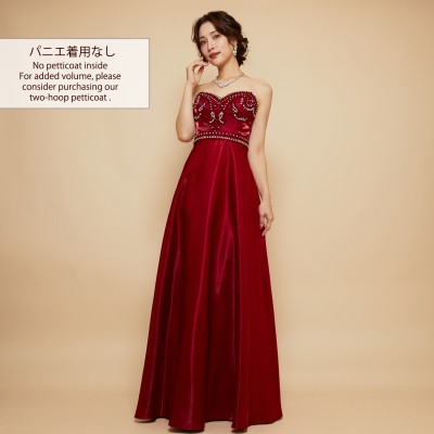 すっきりとしたウエストラインと深めのハートカットがエレガントなシャイニーサテンドレス。身頃の煌びやかなオーロラクリスタルやアイボリーカラービーズ刺繍は1着ずつ全て手作業で仕上げた、こだわり満載の贅沢なデザインです。暖かで優しい印象のクリームパールカラー。