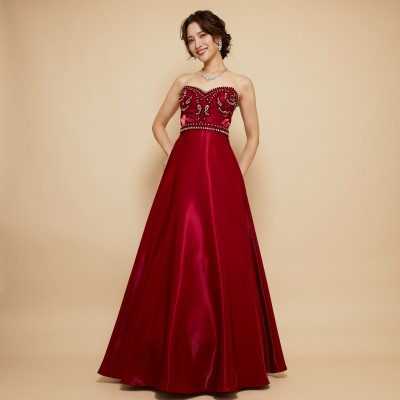 すっきりとしたウエストラインと深めのハートカットがエレガントな、シャイニーサテンドレス。身頃の煌びやかなオーロラクリスタルや深紅のカラービーズ刺繍は1着ずつ全て手作業で仕上げた、こだわり満載の贅沢なデザインです。艶やかで魅力的なルージュレッドカラー。