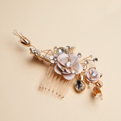 ボリューミーな立体ミルキーピンクフラワーにクリアストーンとパールを散らした豪華なゴールドカラーのヘアコーム。ドレススタイルを一層魅力的にするヘアアクセサリーです。