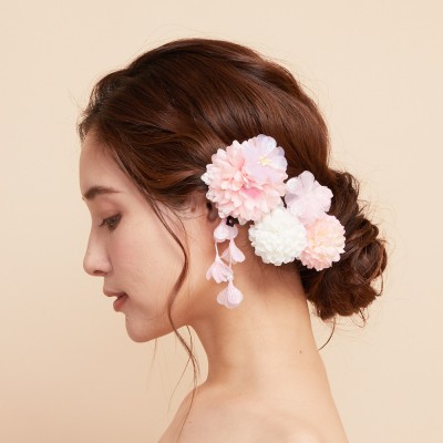 様々な形状やカラーのフラワーモチーフをミックスしたヘアコサージュ4点セットです。ピンク・ホワイト系の可愛らしいミックスカラー。
