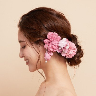 様々な形状やカラーのフラワーモチーフをミックスしたヘアコサージュ3点セットです。スモークピンク・パ-プル系の大人っぽいくすみミックスカラー。