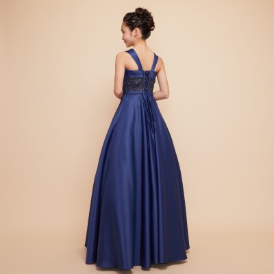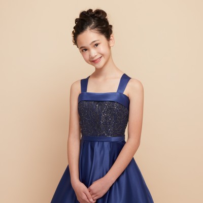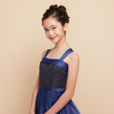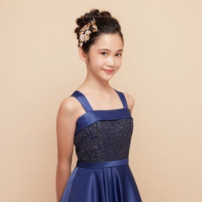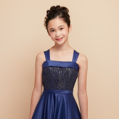 落ち着きのあるシックなネイビーカラーと上質なサテン生地の質感が優雅な雰囲気のジュニアドレスです。王道のクラシカルAラインドレスはパニエを使って華やかに、パニエ無しでスタイリッシュにと様々な表現が可能。コンクールや発表会用ステージドレスにおすすめです。