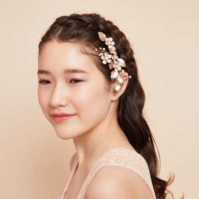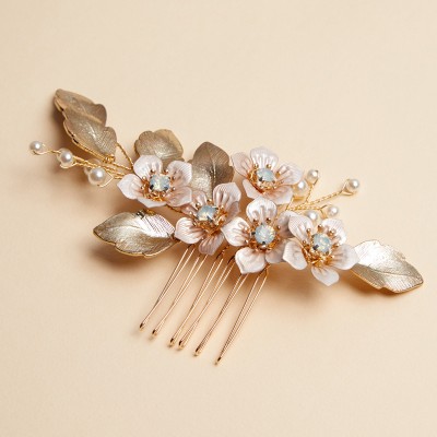 ミルキーピンクフラワーゴールドリーフヘアコーム