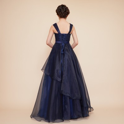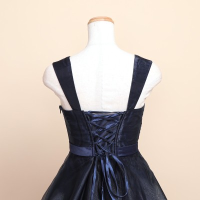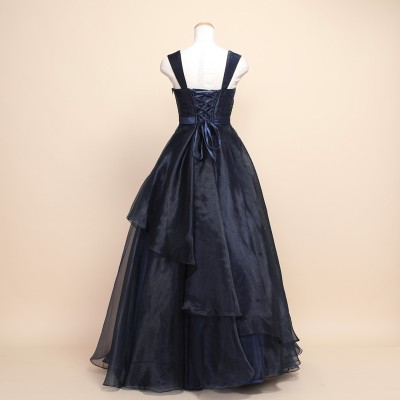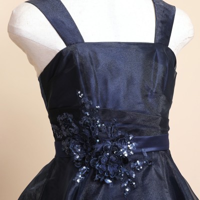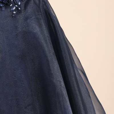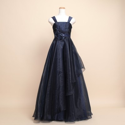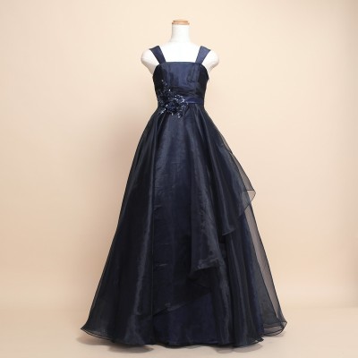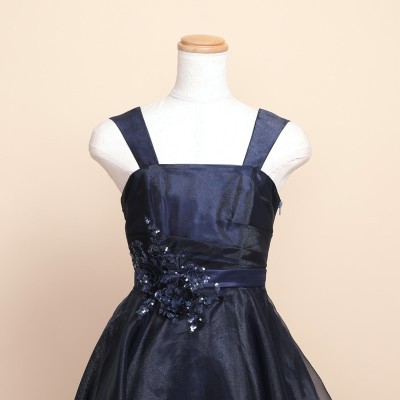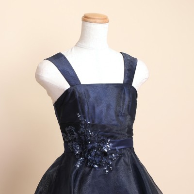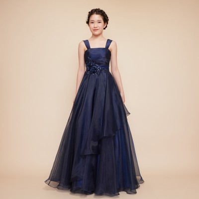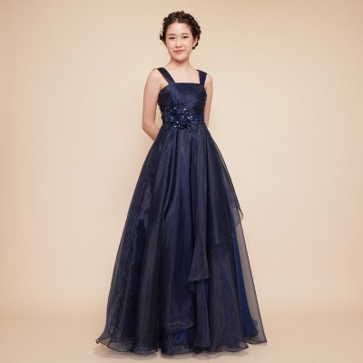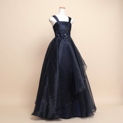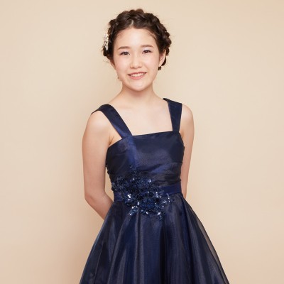 レイヤースカートデザインが特徴的なオーガンジー仕立てのジュニアドレスです。ウエストにはキラキラと光るスパンコールとレースで仕立てた立体的なフラワーモチーフをのせ豪華なワンポイントに。パニエを入れてスカートを大きく広げれば、透明感あるオーガンジーのレイヤーがふわりと一層華やかになります。ピアノやバイオリンなどの発表会用ジュニアドレスをお探しの方にぜひおすすめです。コンクールにも使いやすい、落ち着きあるディープネイビーカラー。