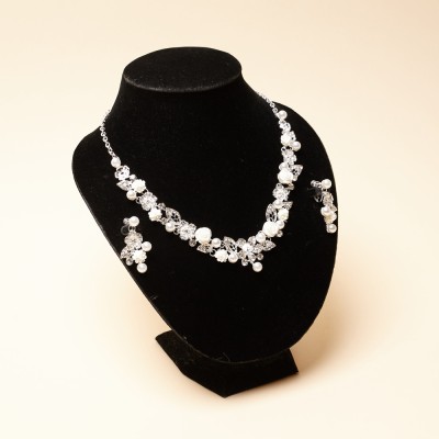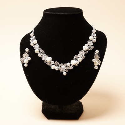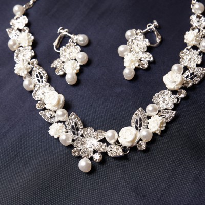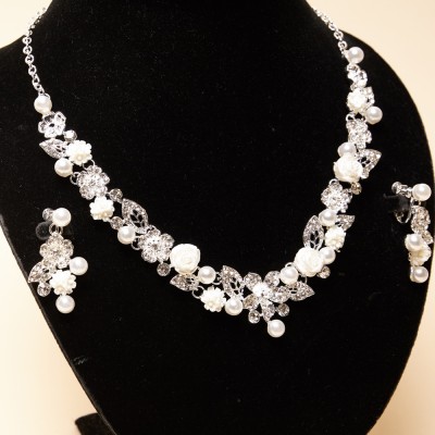 可憐なフラワーモチーフをふんだんにあしらったキュートなネックレスイヤリングセット。真っ白なウェデングドレスやパステルカラーのドレスに合わせてとびっきり可愛らしく着こなすのもおすすめです。