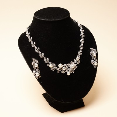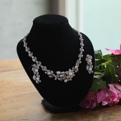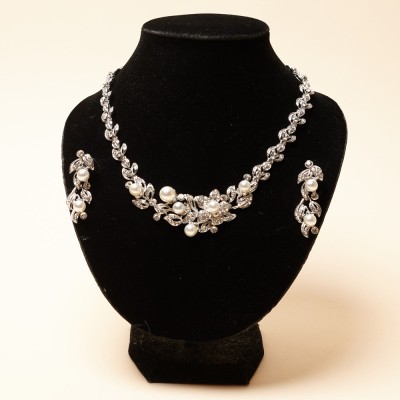 アシンメトリーなフラワーデザインと大粒パールの存在感が華やかなネックレスイヤリングセット。豪華な衣装にも負けないボリューム感あるアクサセリーです。