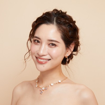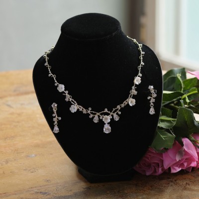 蔦のようなデザインのお洒落なネックレスイヤリングセット。可愛らしいホワイトフラワーと大粒のストーンがアクセントです。パステルカラーのドレスに合わせやすい柔らかい印象のゴールドカラー。
