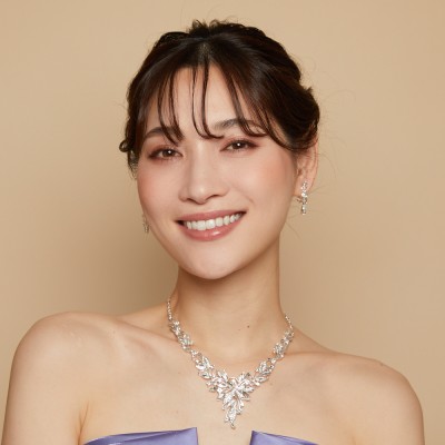 ウェーブがかったリーフデザインがエレガントなネックレスイヤリングセット。V字ラインのネックレスは、ハートカットのドレスに合わせやすいデザインです。