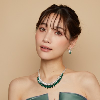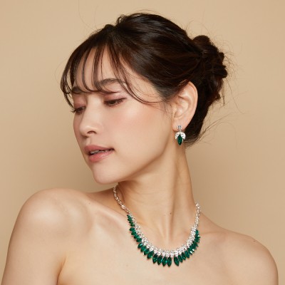 透明感あるエメラルドグリーンカラーのストーンが連なった、ネックレスピアスセット。ドレスカラーと合わせた個性的な着こなしがおすすめです。