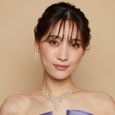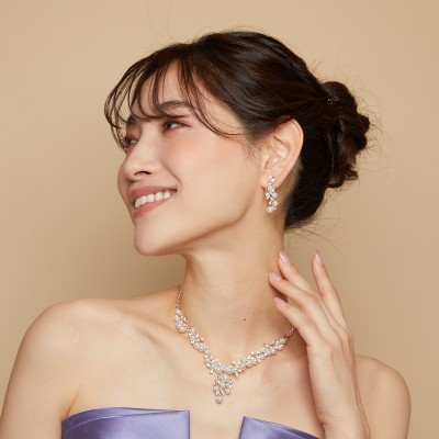 小粒パールをぎゅっと集め、なだらかなウェーブラインで囲んだシルバーカラーのネックレスピアスセット。控えめなボリューム感ながらもデザイン性のあるアクセサリーです。